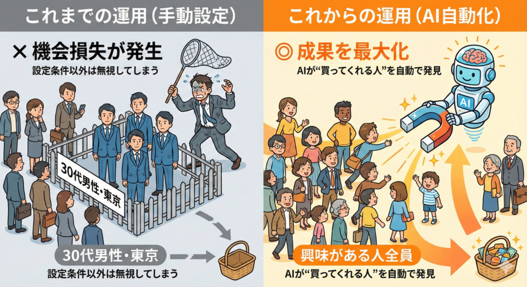 従来の手動設定は、上司(あなた)が営業マンに対し、「A町のB丁目に住む、30歳の男性だけにチラシを配れ」と細かく指示を出している状態です。これでは、隣の町にすごく興味を持っている人がいても、営業マンは無視してしまいます。