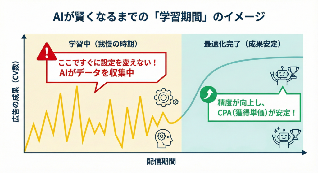 AIは、広告配信が始まってから「あ、こういう人がクリックしてくれるんだ」というデータを蓄積し、徐々に賢くなっていきます。そのため、配信開始直後は成果が安定しないことがよくあります。